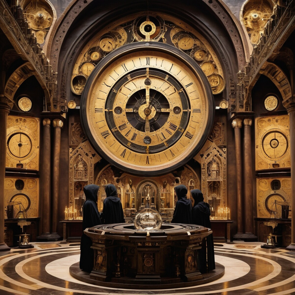 Внутри храма они увидели группу тенебрианцев — высоких, тонких существ, одетых подобно чернякам в чёрные мантии с капюшонами, чьи тела словно состояли из концентрированной тьмы. Они окружили центральный алтарь, где пульсировал Хронограф — древний механизм, напоминающий сложные астрономические часы, где каждая шестерёнка и маятник представляли различные аспекты времени.