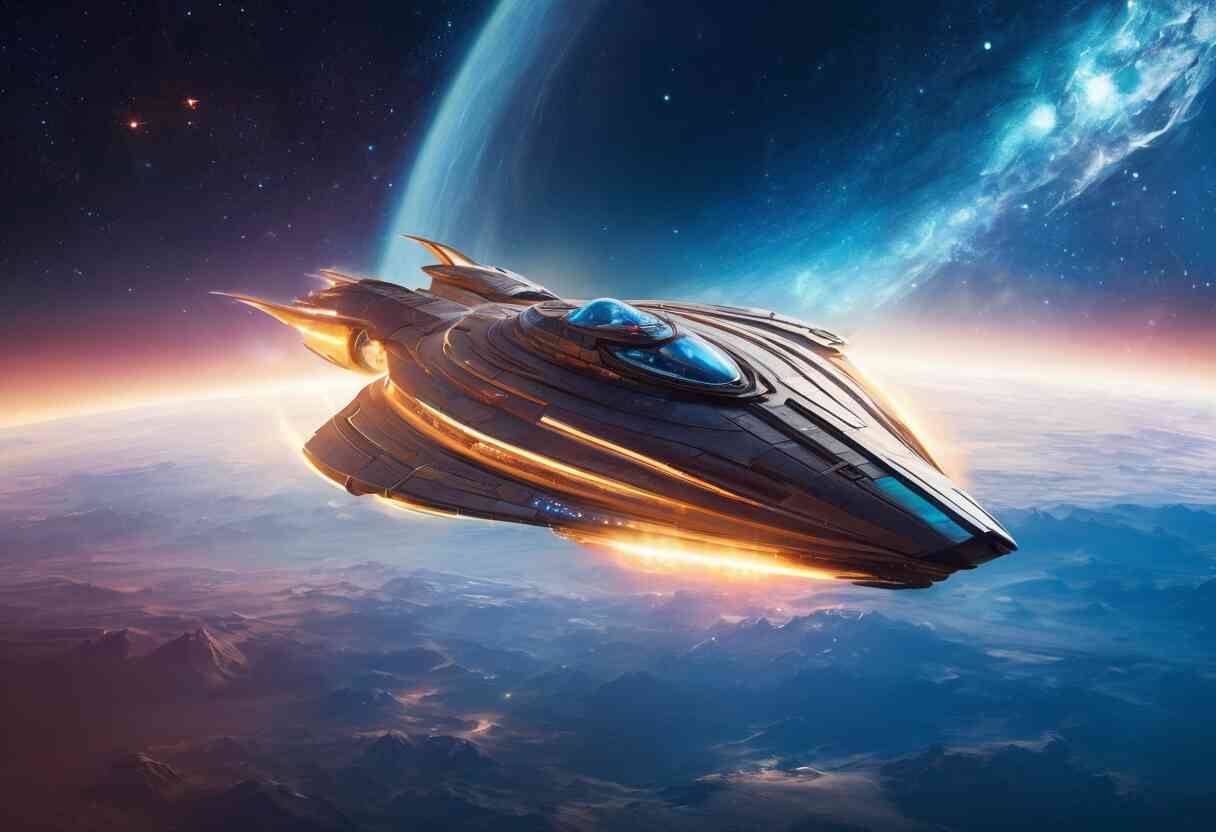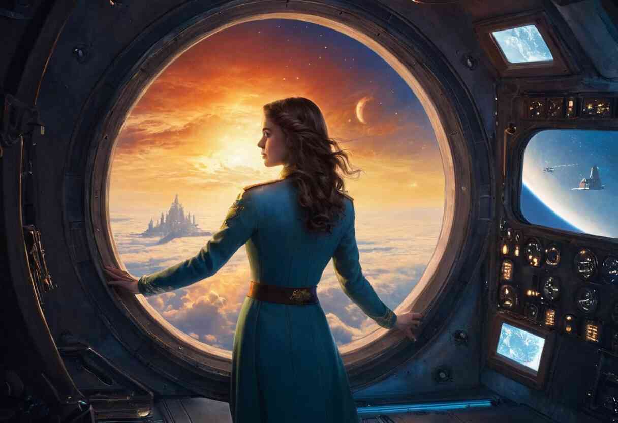 На фоне звёздного пейзажа космического портала плавно пролетал корабль "Аврора", вышедший из гиперпространства. Дарина, уверенно удерживала руль, Бронислава смотрела на звёзды через иллюминатор. Девушки начали готовиться к возвращению на базу после успешной миссии.