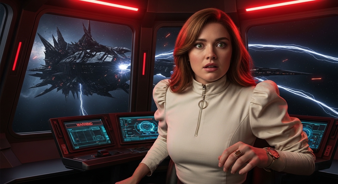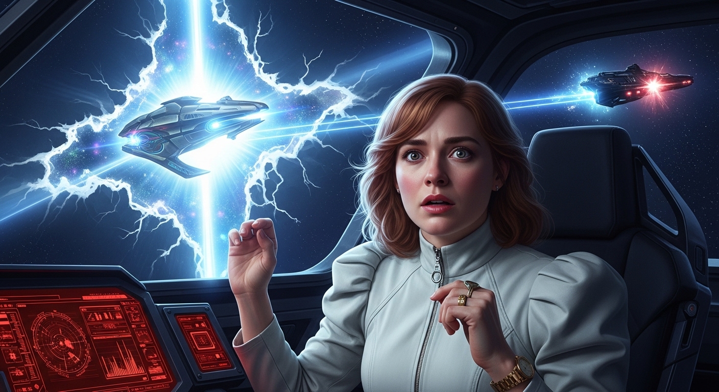 На экране замаячило чёрное вражеское судно — угловатое, словно высеченное из тьмы. Его пушки выплёвывали сгустки тёмной плазмы, искажающие само пространство.