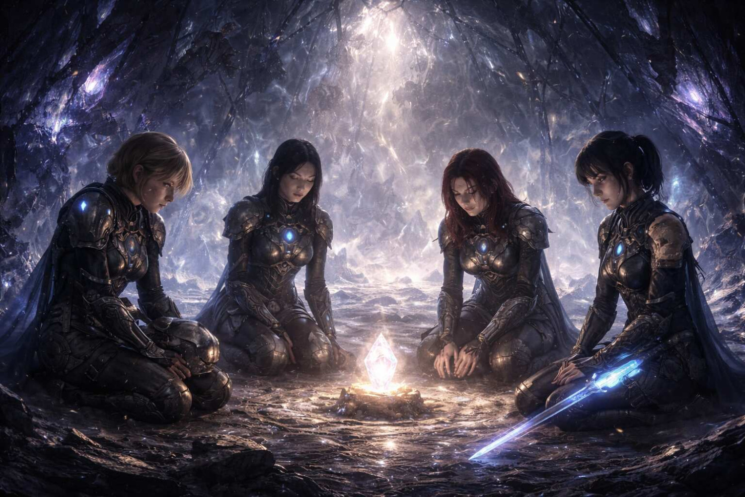 Элара, Йена, Серафима и Кира опустились на колени, образовав круг вокруг кристалла. Они начали «молитву» — не внешнее произнесение слов, а внутренний ритуал очищения через покаяние и отсечение страстей. Каждая из них смирила своё «я» — страх, гордость, гнев, желание власти. Они стали «пустыми сосудами».