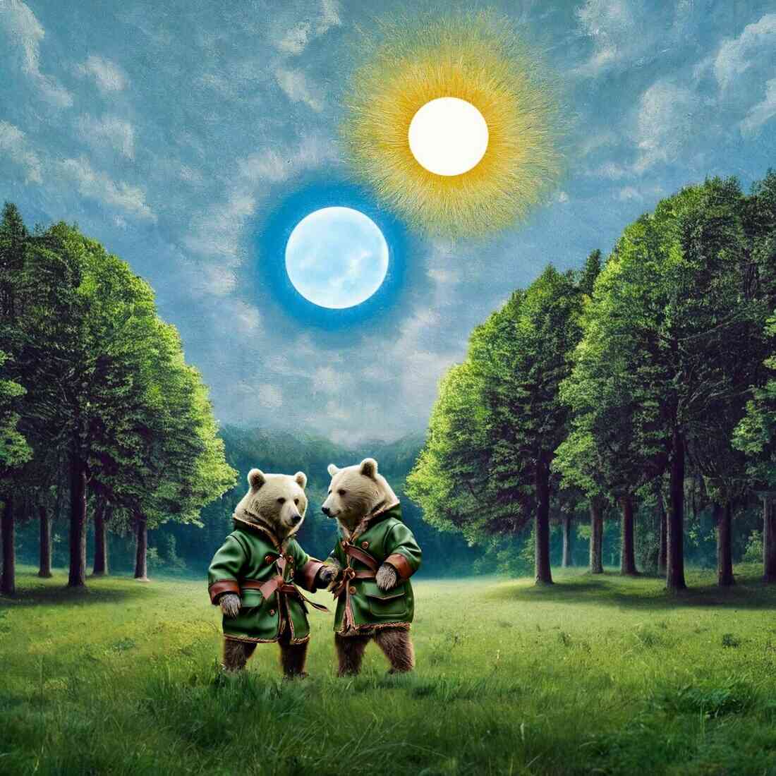 Вдруг всё затихло. Братья медвежата своим хохотом и топотом всех разогнали и распугали. Это Весея медведица вышла со своими сыновьями, Благомиром и Видомиром, погулять.