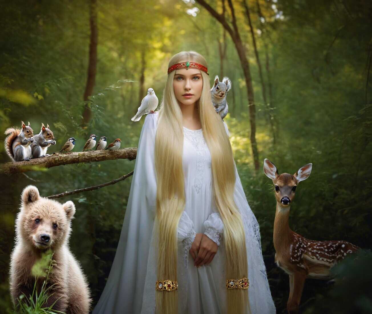 Аруна, одетая в длинное белое платье, шла к ним в окружении животных и птиц. На её голове красовалось очелье с орнаментом, а золотистые волосы доходили до колен. На одном плече у неё сидела белка, а на другом — белый голубь.